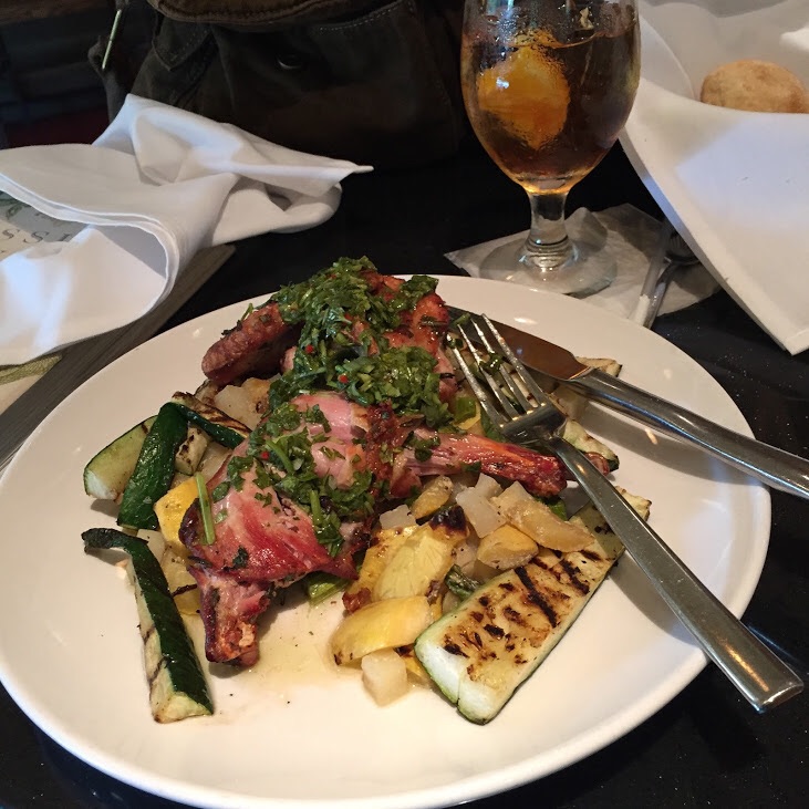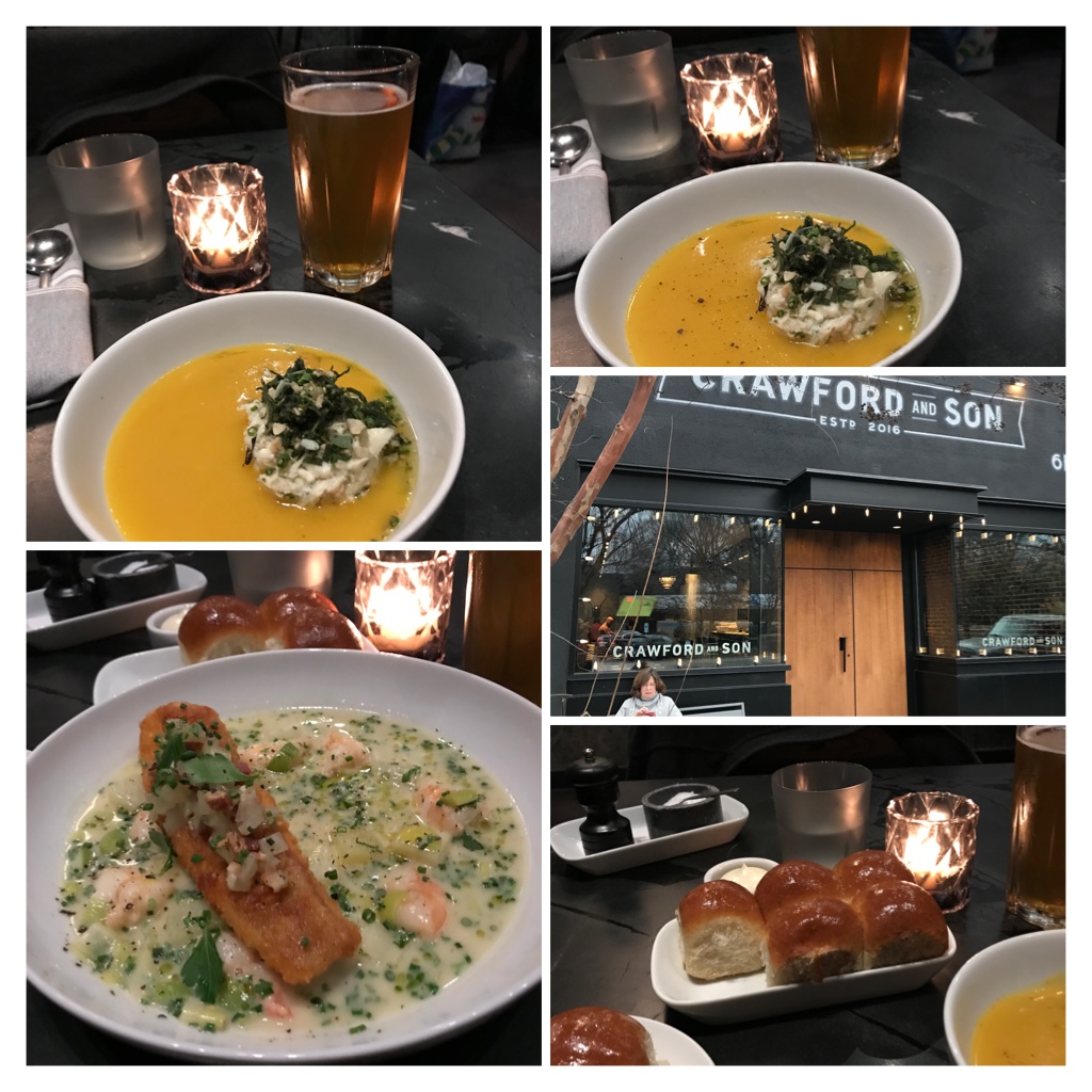 Thursday January 9th @ Crawford and Son. My menu choices: Butternut squash soup with crab, pepita, brown butter and sage. They served the dish very uniquely– the bowl arrived with the crab & sage already in the dish, and the server poured the creamy, buttery soup gently into the bowl. Nicely done!!!