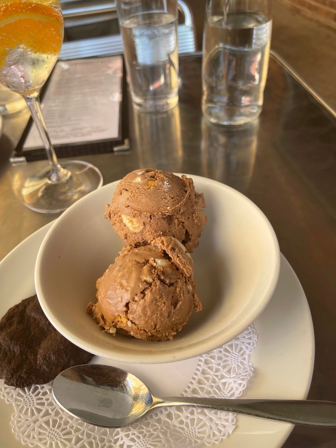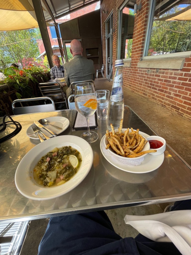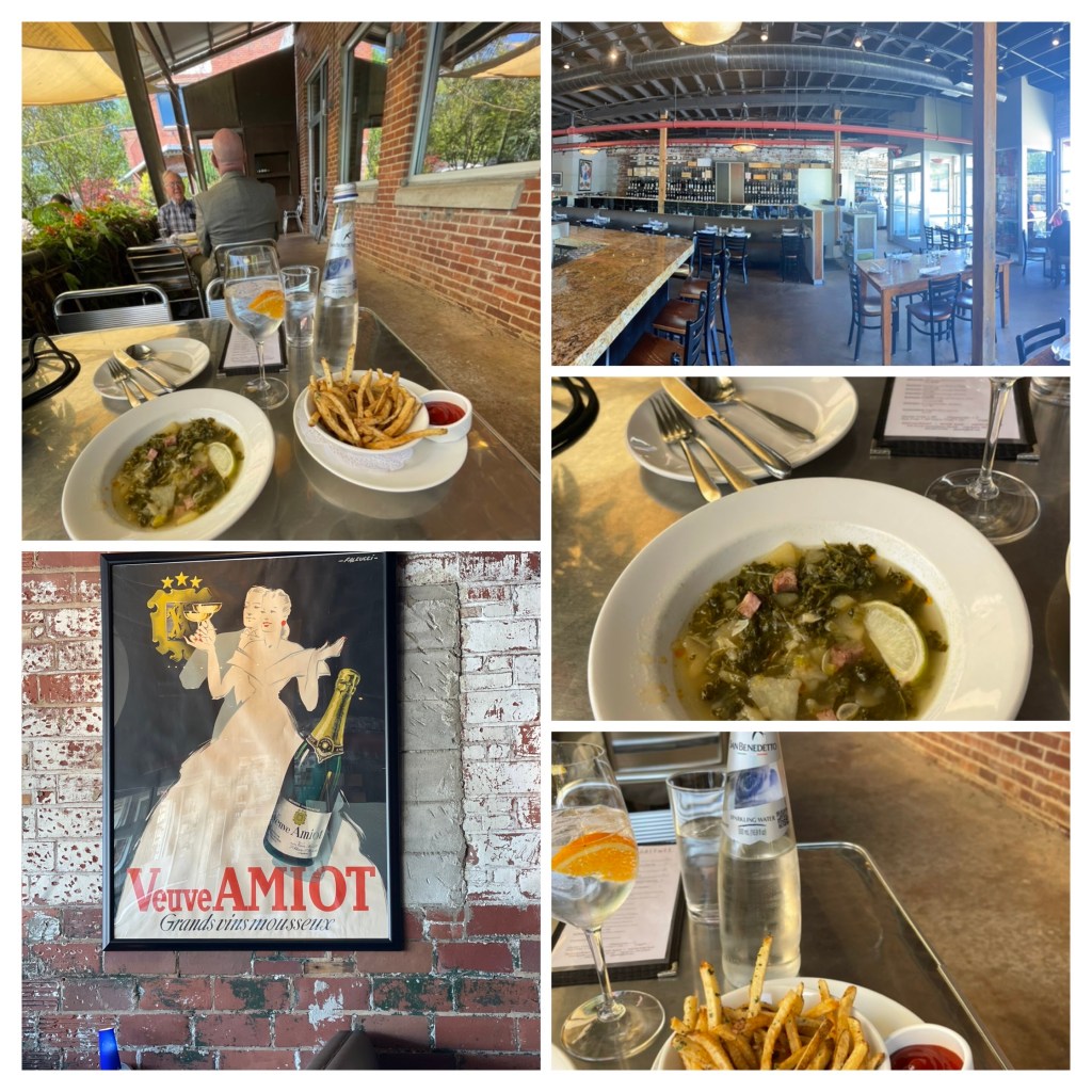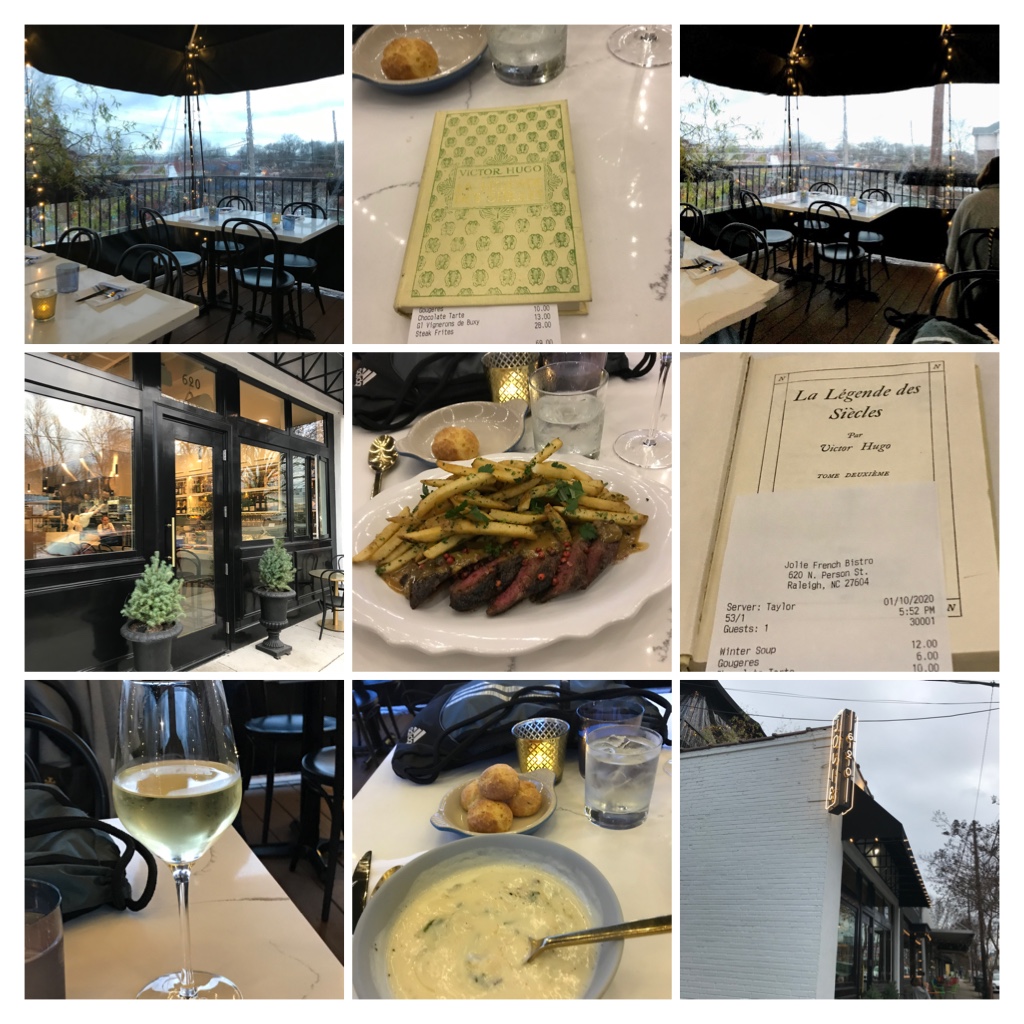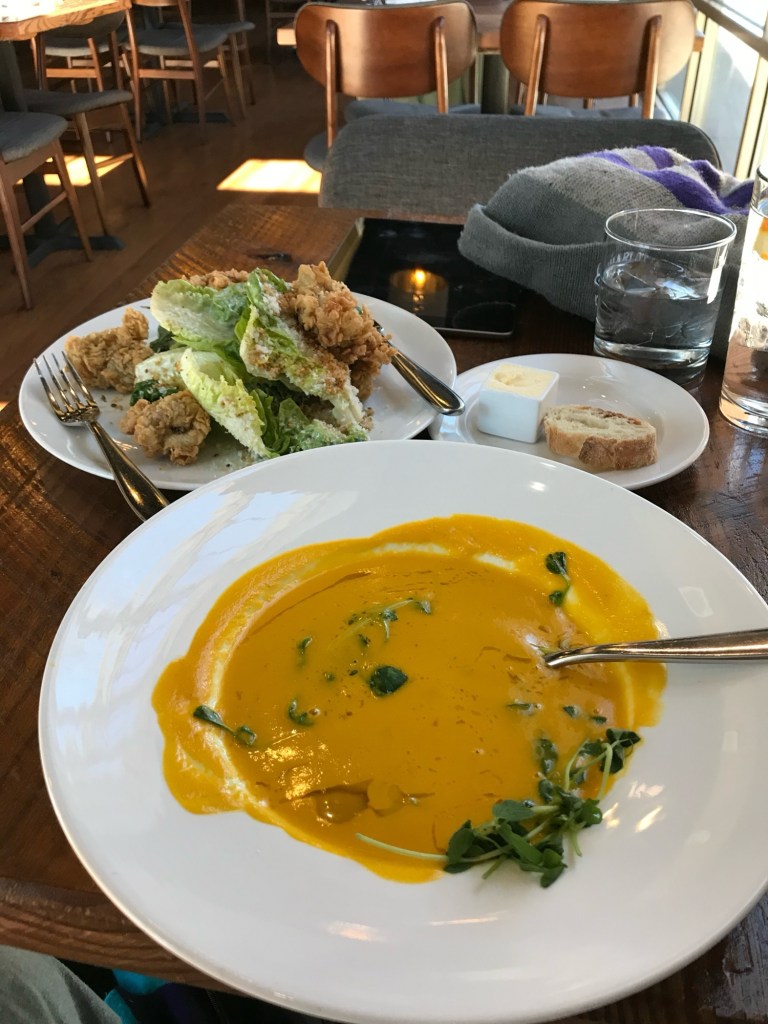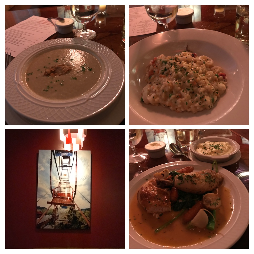 My menu choices for Jolie — started with the Gougeres, a savory cheesy puff pastry and A wonderfully creamy bowl of winter soup made with apples, smoked pecans and brown butter. The entree of choice steak frite — a tender flat iron in a sauce au poivre with herbes frite.