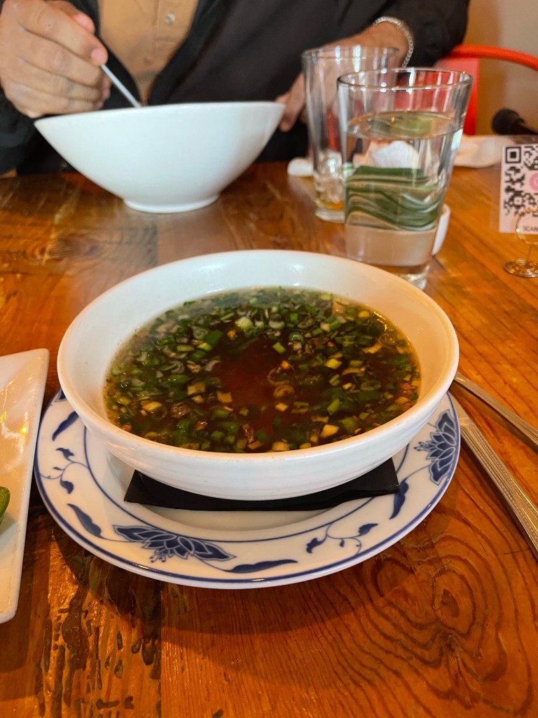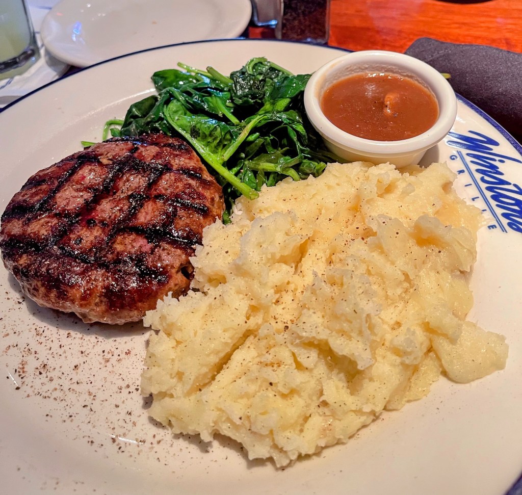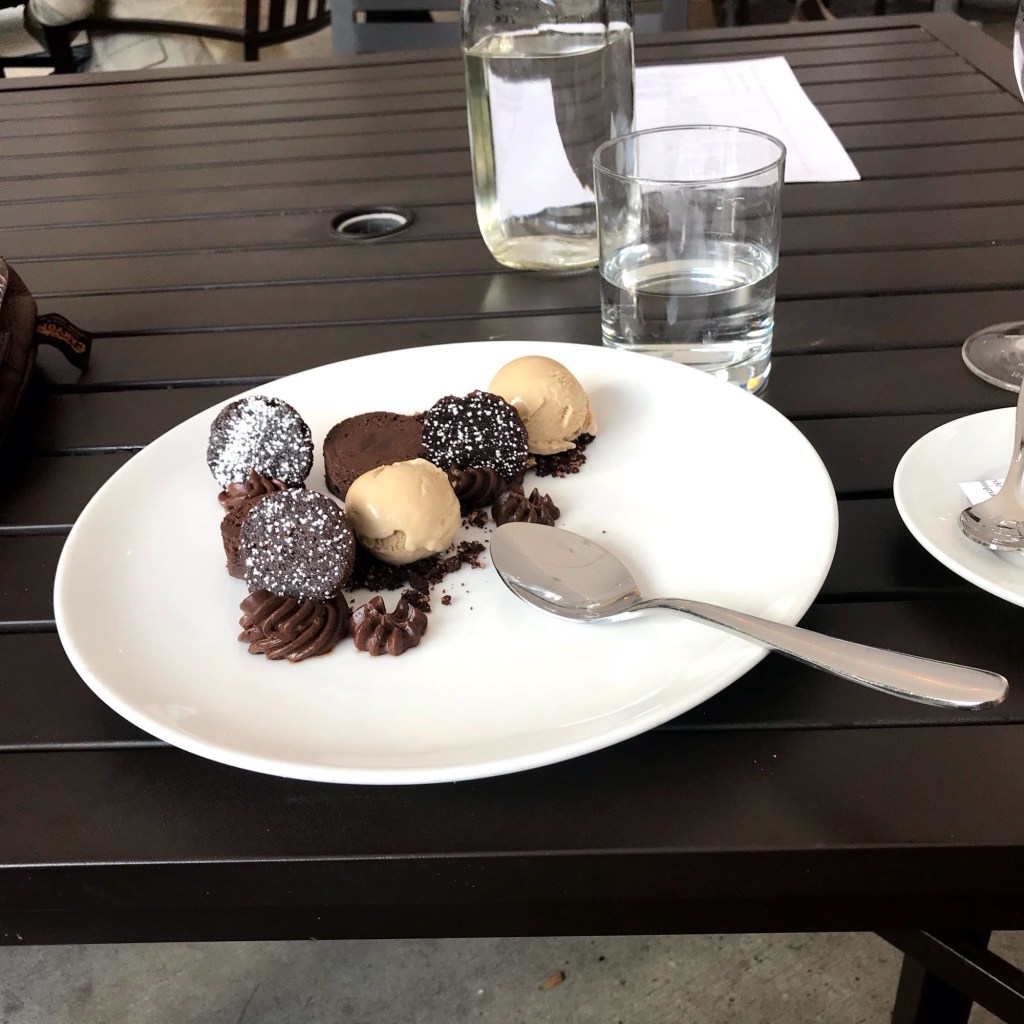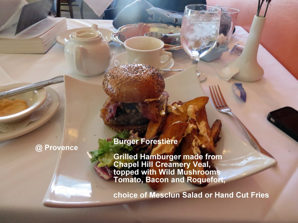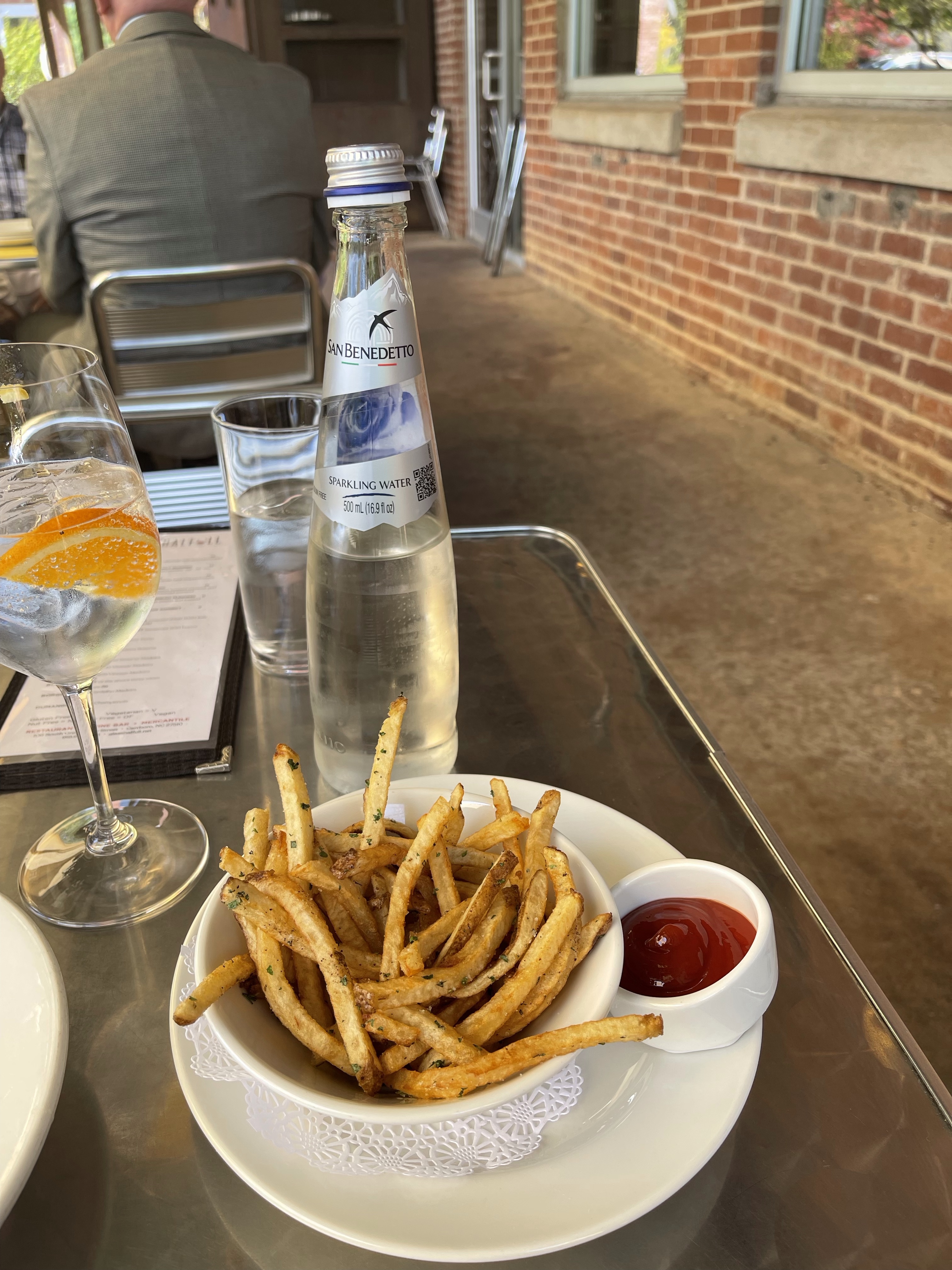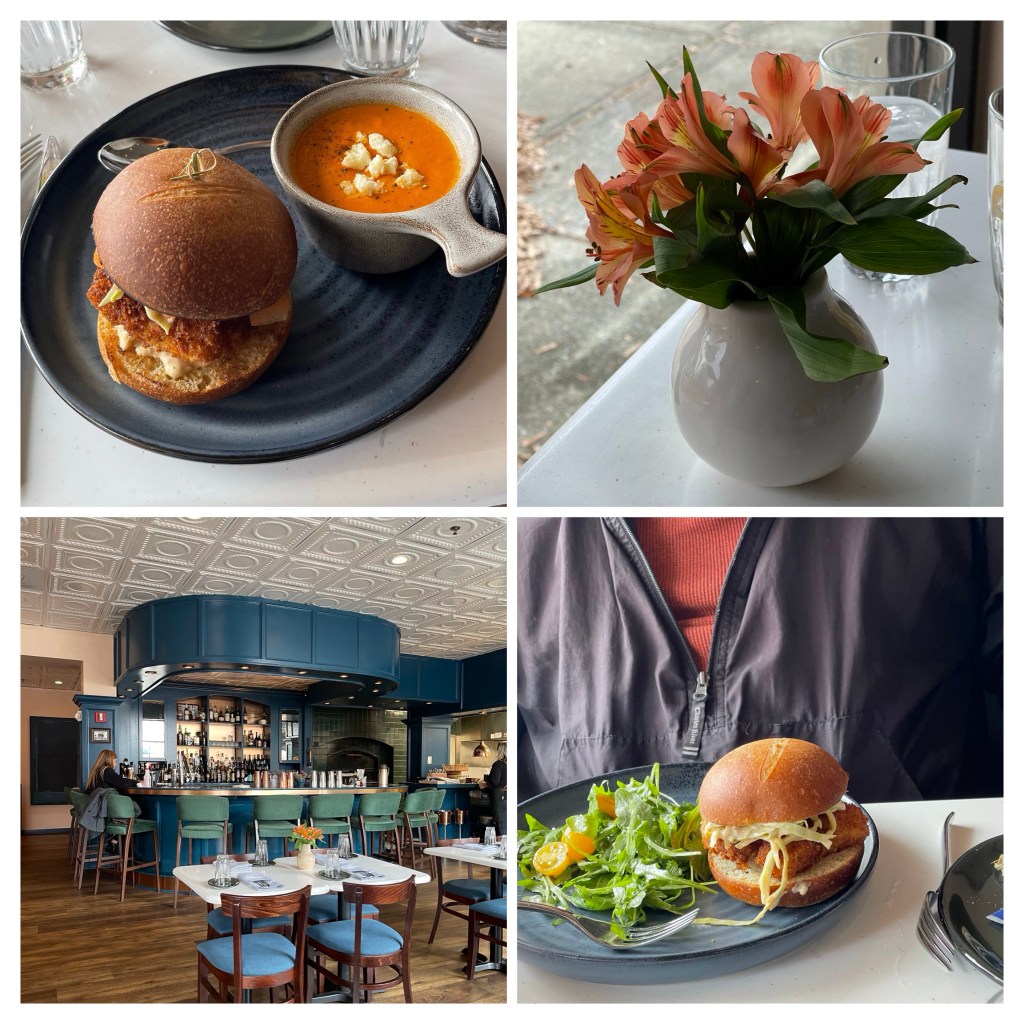 My menu choices for Jolie — started with the Gougeres, a savory cheesy puff pastry and A wonderfully creamy bowl of winter soup made with apples, smoked pecans and brown butter. The entree of choice steak frite — a tender flat iron in a sauce au poivre with herbes frite.