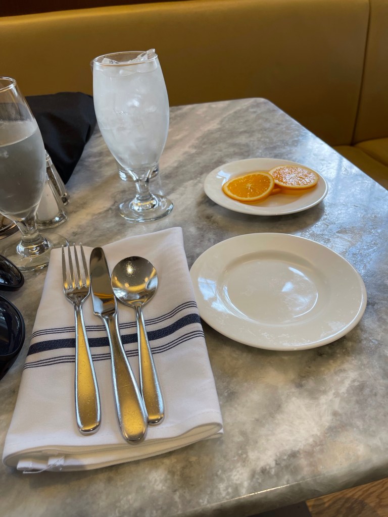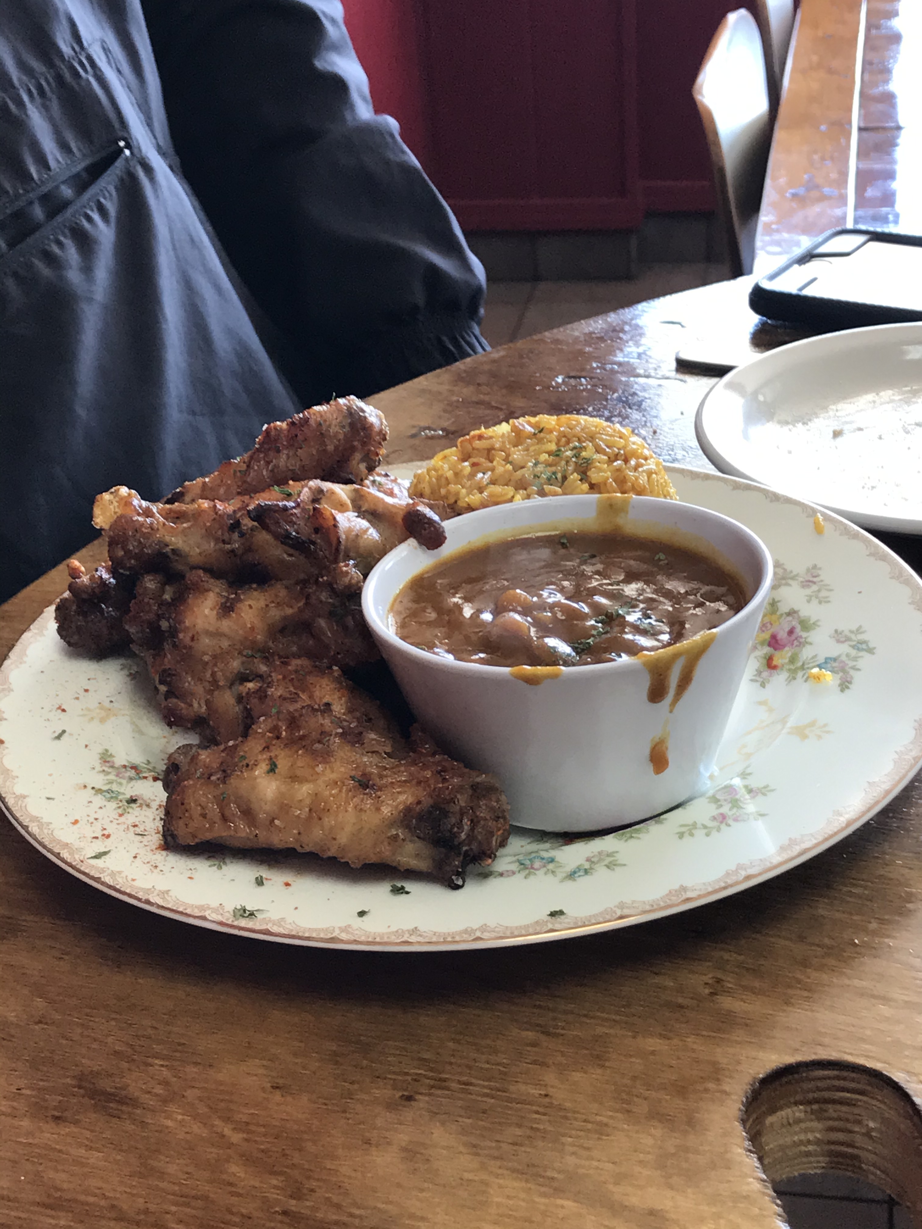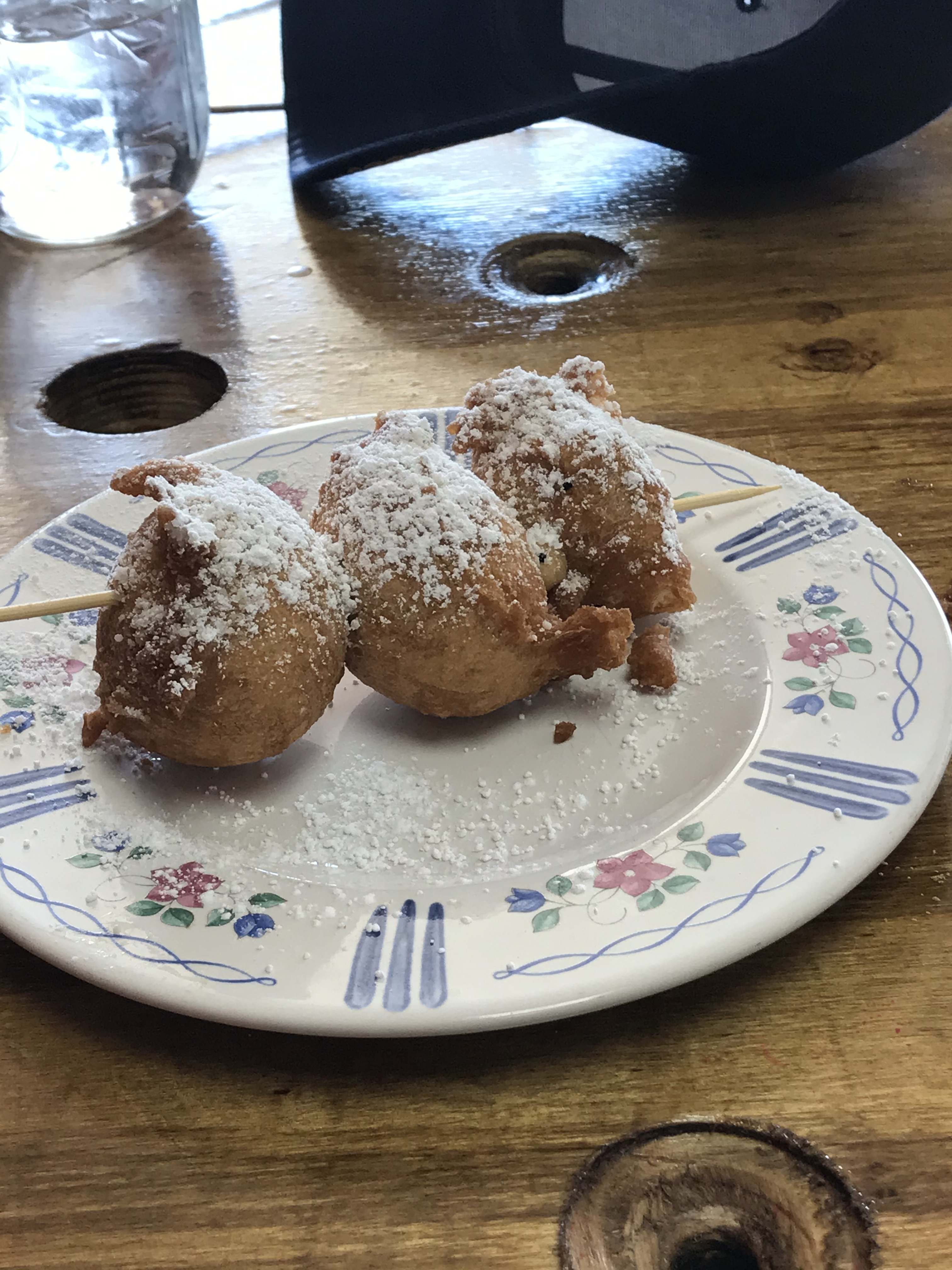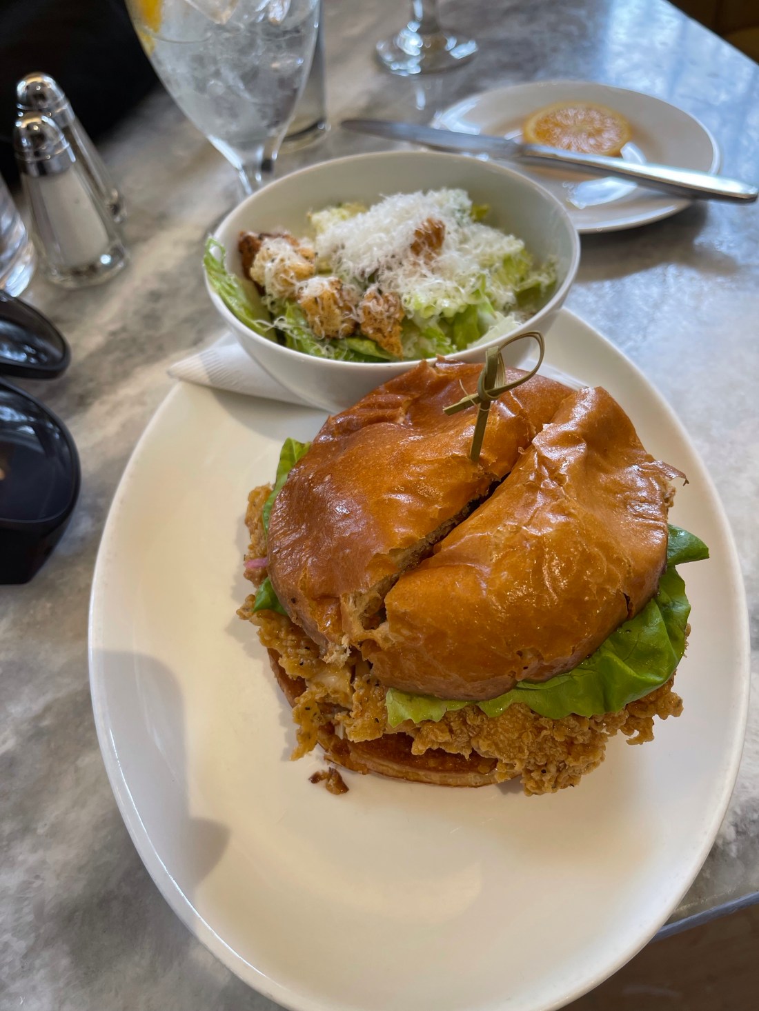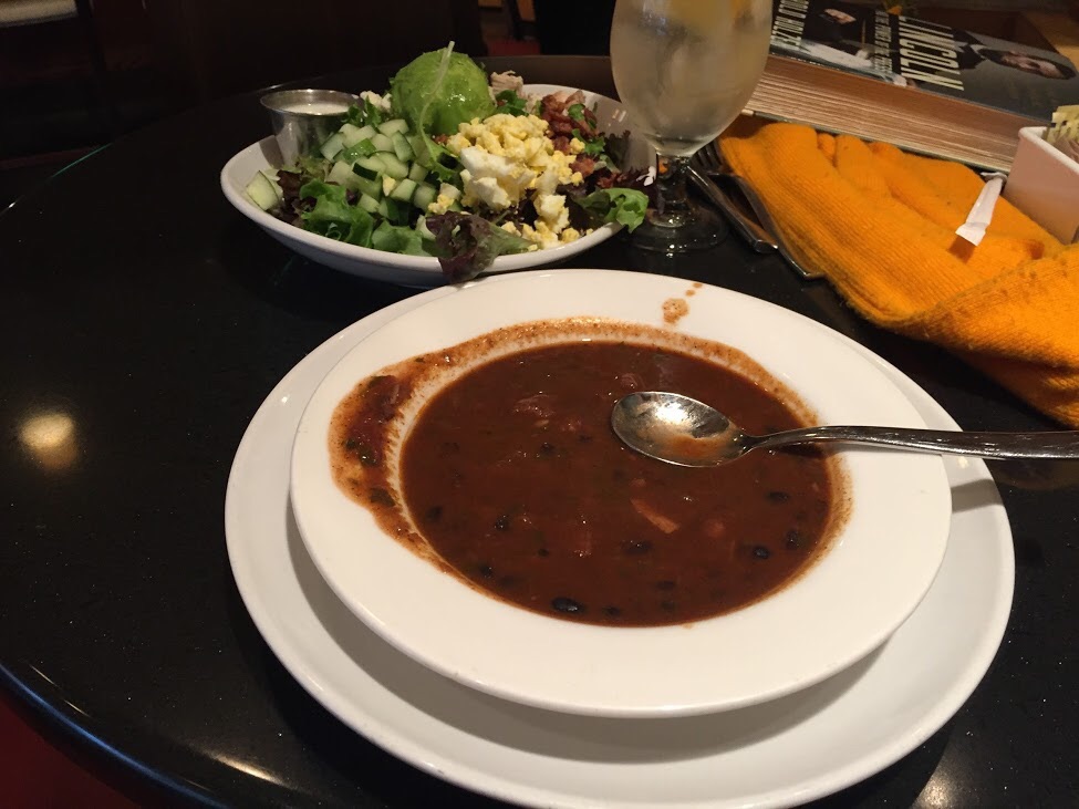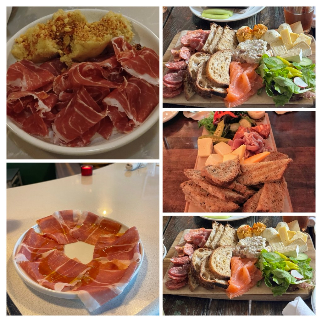 My menu choices for Jolie — started with the Gougeres, a savory cheesy puff pastry and A wonderfully creamy bowl of winter soup made with apples, smoked pecans and brown butter. The entree of choice steak frite — a tender flat iron in a sauce au poivre with herbes frite.