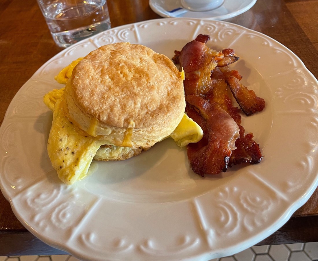 Sausage, egg and cheese with freshly baked biscuit and a little bacon on the side. A nice cup of cappuccino was also involved.