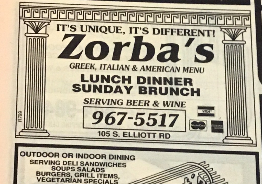 Zorba’s was different and a favorite. It was located at Kroger Plaza aka Eastgate on South Elliott next to another hot spot for me, the Plaza movie theater. It was great food in a cozy inviting place.