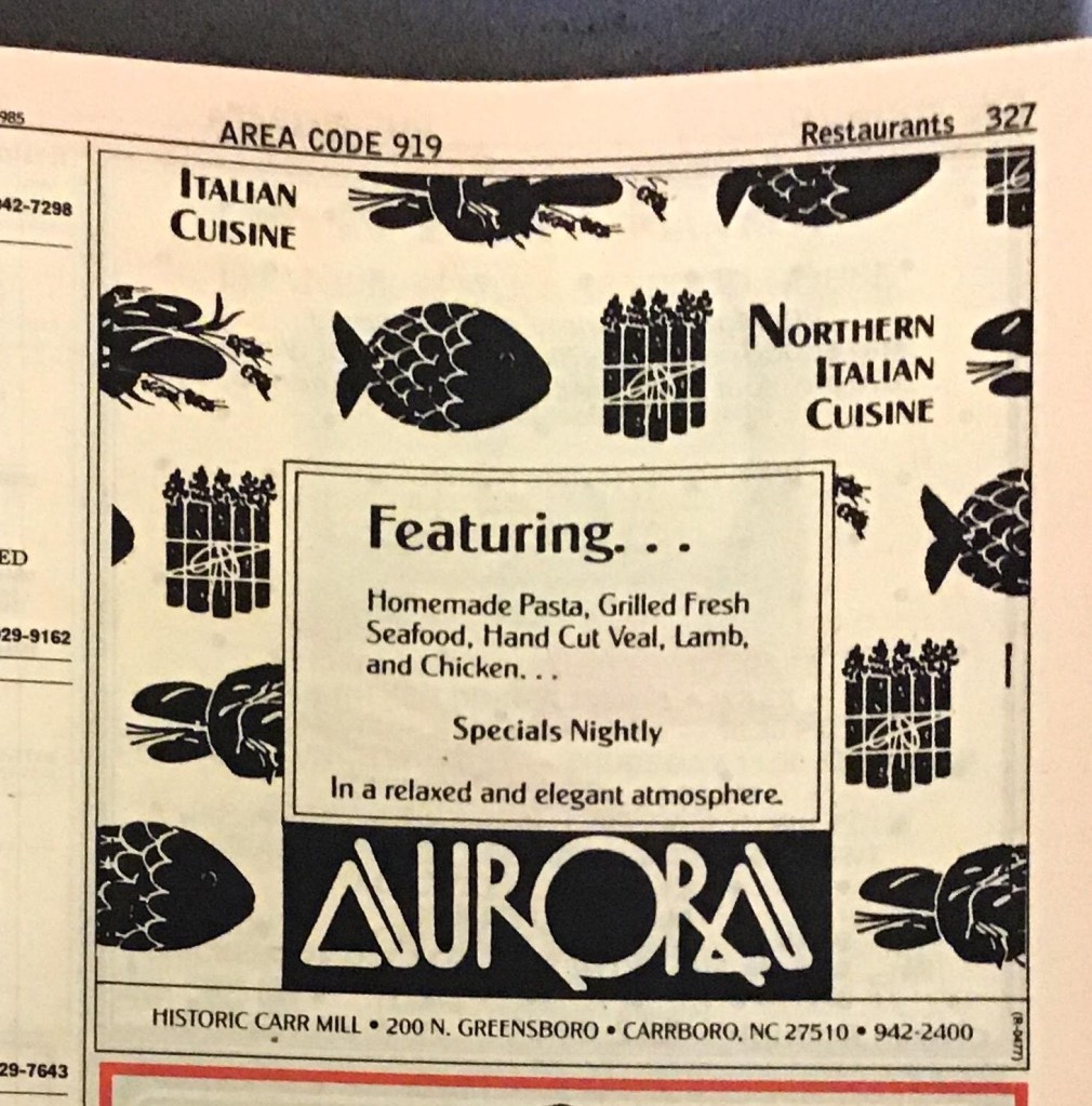 Aurora may possibly have been my all-time favorite restaurant in Chapel Hill. The above ad’s statement in a relaxed and elegant atmosphere was really true. It wasn’t just the quality of the food. It was the way the place was designed—the polished hardwood floors and wide spacious windows have remained unchanged, either by the owners of the mall or many fine tenants have included Panzanella and now Tandem.