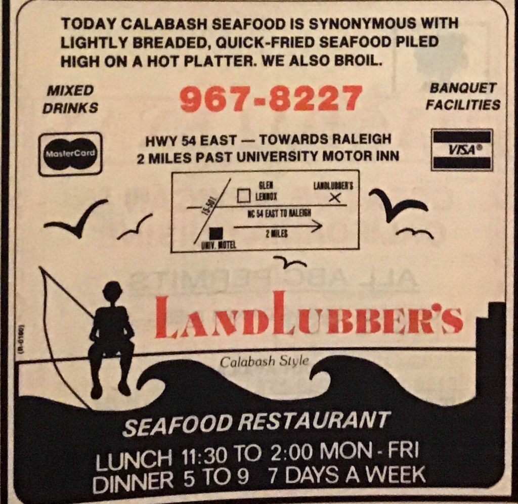 LandLubber’s would change all of that for me. My friend and colleague, Ron Bartholomew and I often ventured away from lunches on Franklin Street and headed towards South Square for lunch and places like Bullocks, K and W, and interesting places at South Square Mall. LandLubber’s which was located on Highway 54 in a gray building across the street from Hardees. I don’t know if had been recommended to or it was favorite we went frequently.